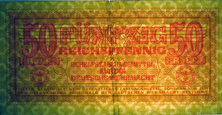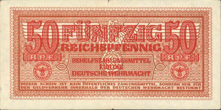 50 Reichspfennig; o. D. (ab 1942); Grabowski DWM-5 (504/M35); Druckfarbe rotbraun, auch ocker; Papier weiß; Udr. Adler mit Hakenkreuz; Wz. Kreuzblüten; ohne KN; "Behelfszahlungsmittel für die Deutsche Wehrmacht“ |