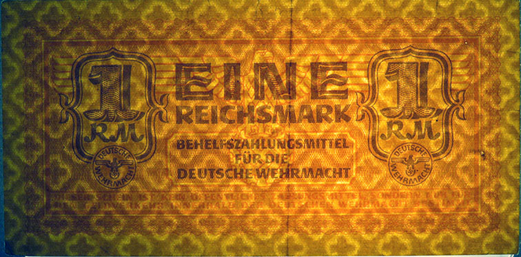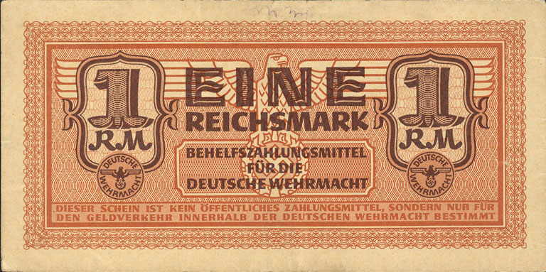 1 Reichsmark; o. D. (ab 1942); Grabowski DWM-6 (505/M36.); Druckfarbe ocker; Papier gelbbraun; Udr. Adler mit Hakenkreuz; Wz. Kreuzblüten; ohne KN; "Behelfszahlungsmittel für die Deutsche Wehrmacht“ |