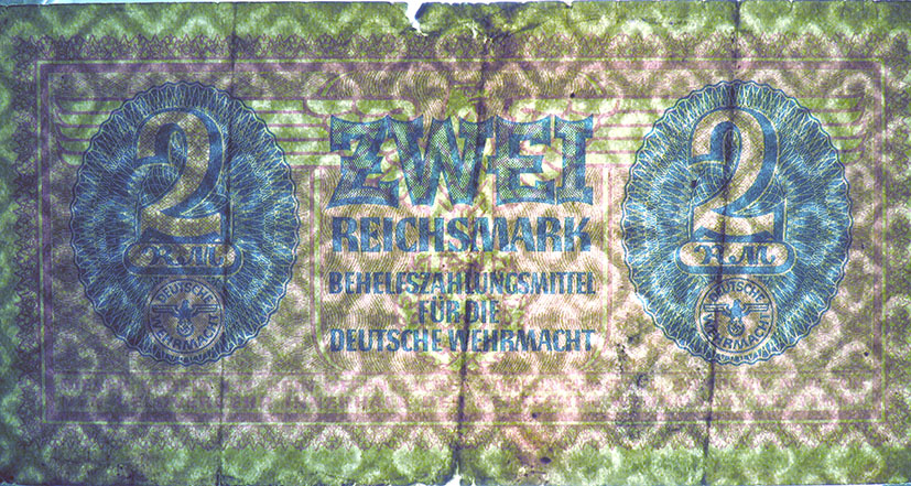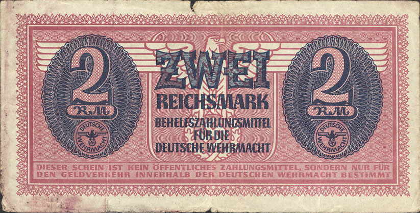 2 Reichsmark; o. D. (ab 1942); Grabowski DWM-7 (506/M37.); Druckfarbe dunkelblau, auch lila; Papier grau; Udr. Adler mit Hakenkreuz; Wz. Kreuzblüten; ohne KN; "Behelfszahlungsmittel für die Deutsche Wehrmacht“ |