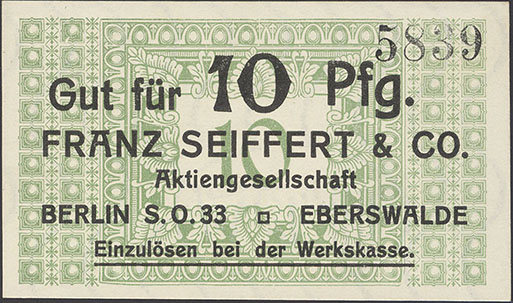 10 Pfennig; o. J.; 1918/19; Schoenawa Dcd.11; KN gestempelt; Wz. Haussmann-Wellen; Vs: "Gut für 10 Pfg. Franz Seiffert & Co. Aktiengesellschaft Berlin S.O. 33 Eberswalde" Einzulösen bei der Werkskasse; Rs: leer; ohne Drfa. |