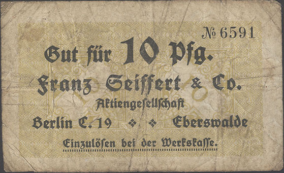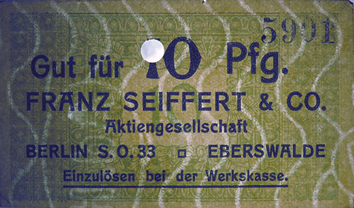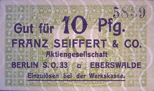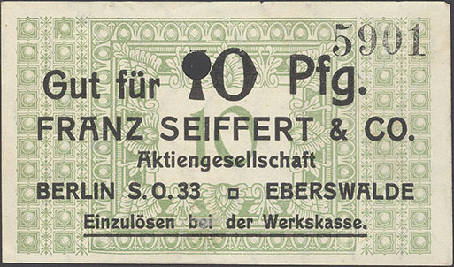 10 Pfennig; o. J.; 1918/19; nicht katalogisiert; KN gestempelt; Wz. Haussmann-Wellen; Vs: "Gut für 10 Pfg. Franz Seiffert & Co. Aktiengesellschaft Berlin S.O. 33 Eberswalde" Einzulösen bei der Werkskasse; Rs: leer; ohne Drfa.; lochentwertet |
