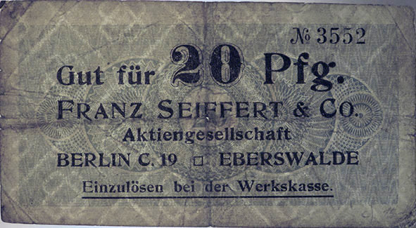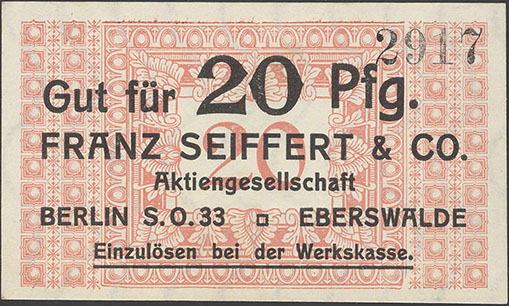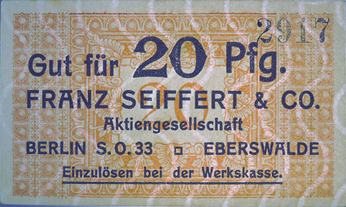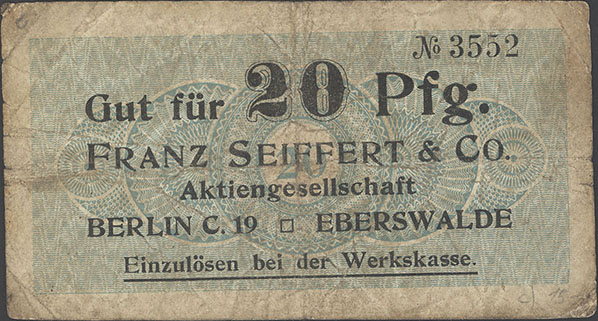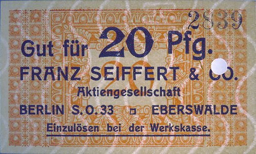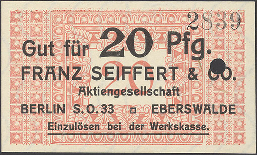 20 Pfennig; o. J.; 1918/19; Schoenawa Dcd.12; KN gestempelt; Wz. Haussmann-Wellen; Vs: "Gut für 20 Pfg. Franz Seiffert & Co. Aktiengesellschaft Berlin S.O. 33 Eberswalde" Einzulösen bei der Werkskasse; Rs: leer; ohne Drfa. |