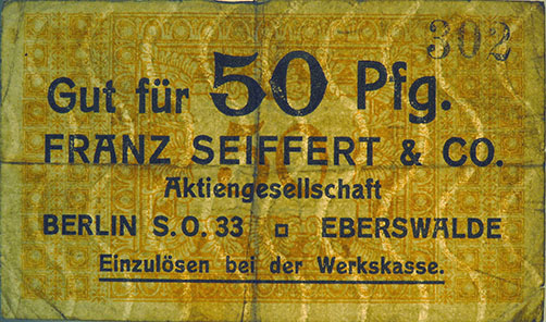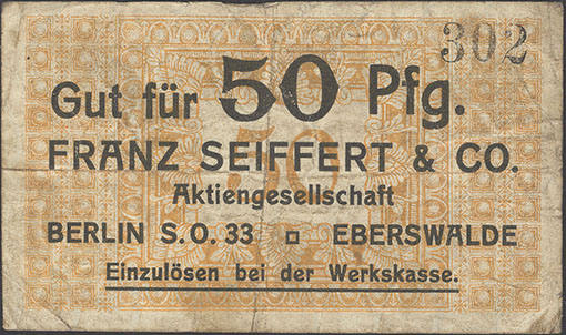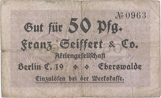 50 Pfennig; o. J.; 1918/19; Schoenawa Dcd.13; KN gestempelt; Wz. Haussmann-Wellen; Vs: "Gut für 50 Pfg. Franz Seiffert & Co. Aktiengesellschaft Berlin S.O. 33 Eberswalde" Einzulösen bei der Werkskasse; Rs: leer; ohne Drfa. |