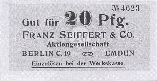 20 Pfennig; o. J.; 1918/19; Schoenawa Dcd.3; Vs: "Franz Seiffert & Co. Aktiengesellschaft Berlin C. 19 und Emden", Einzulösen bei der Werkskasse; Rs: leer; ohne Drfa. |