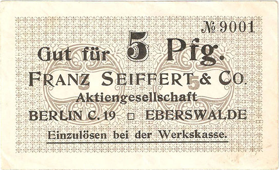 5 Pfennig; o. J.; 1918/19; Schoenawa Dcd.7; Wz. Kreuze in Quadraten; Vs: "Franz Seiffert & Co. Aktiengesellschaft Berlin C. 19 und Eberswalde" Einzulösen bei der Werkskasse; Rs: leer; ohne Drfa.; 2. Serie |