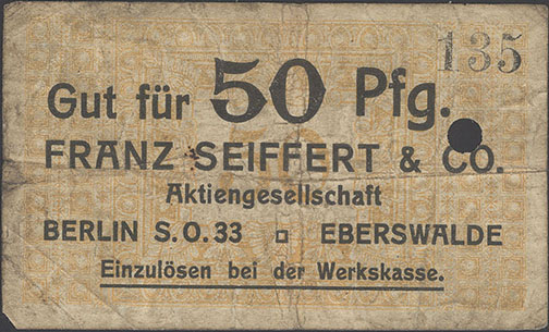 50 Pfennig; o. J.; 1918/19; nicht katalogisiert; KN gestempelt; Wz. Haussmann-Wellen; Vs: "Gut für 50 Pfg. Franz Seiffert & Co. Aktiengesellschaft Berlin S.O. 33 Eberswalde" Einzulösen bei der Werkskasse; Rs: leer; ohne Drfa.; lochentwertet |