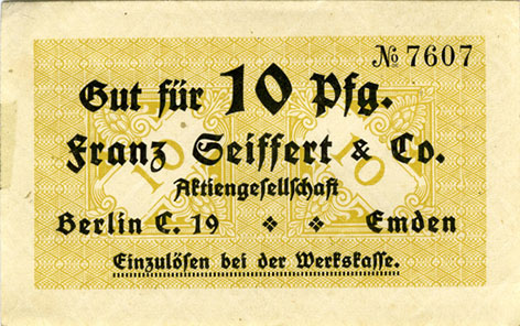 10 Pfennig; o. J.; 1918/19; Schoenawa Dcd.2; Vs: "Franz Seiffert & Co. Aktiengesellschaft Berlin C. 19 und Emden", Einzulösen bei der Werkskasse; Rs: leer; ohne Drfa. |