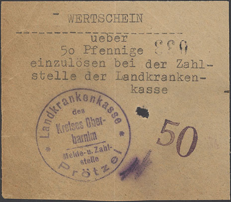 50 Pfennige; o. J.; nicht katalogisiert; Vs.: maschinenschriftlich: WERTSCHEIN ueber 50 Pfennige kopfstehende KH einzulösen bei der Zahlstelle der Landeskrankenkasse Handstempel und gestempelte "50"; Rs.: leer; Karton |