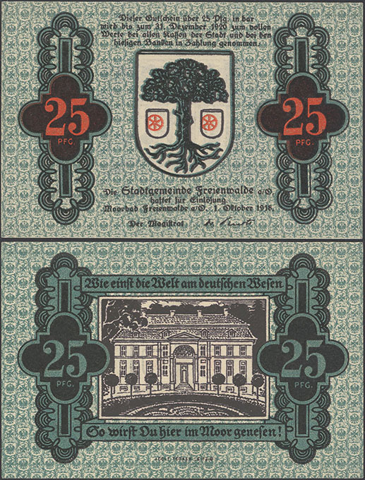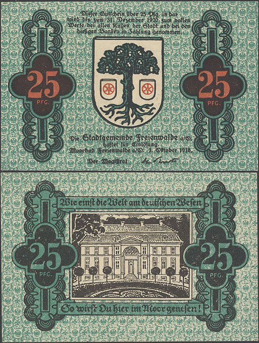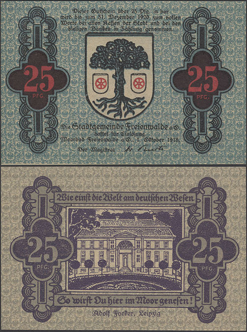 [] | 25 Pfennig; 01.10.1918-31.12.1920; Tieste 05.05.F; Rs.: violett; Wz: Zickzacklinien; Doppeldruck der roten Farbe; Drfa.: Adolf Forker, Leipzig (unten mittig, Antiqua) |