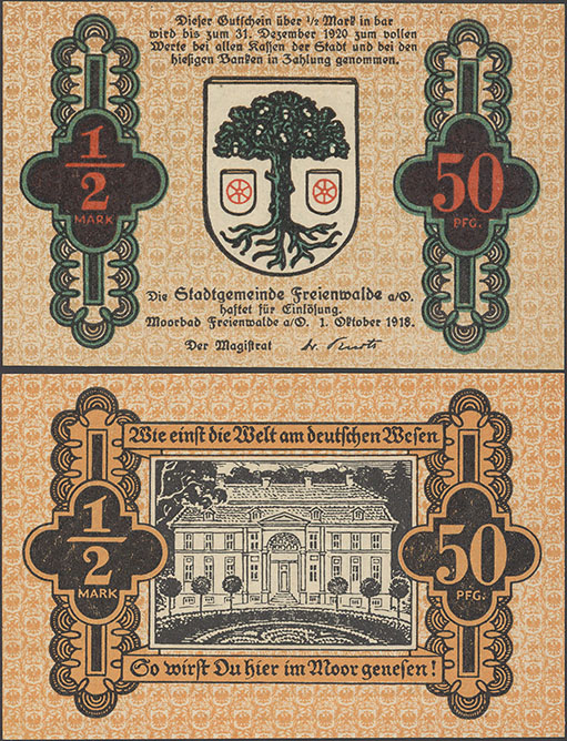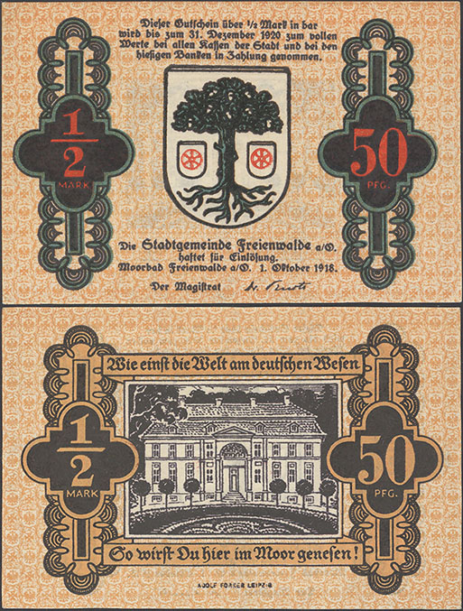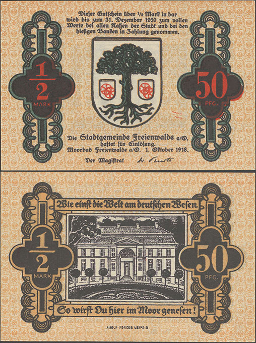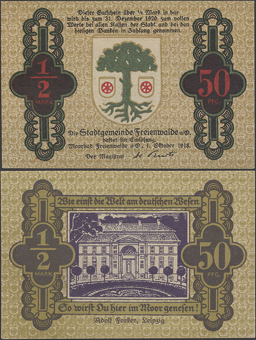 50 Pfennig; 01.10.1918-31.12.1920; Tieste 05.02; Rs.: schwarz; Wz: Sechseckflechtwerk; Drfa.: Adolf Forker, Leipzig (unten mittig, Fraktur) |