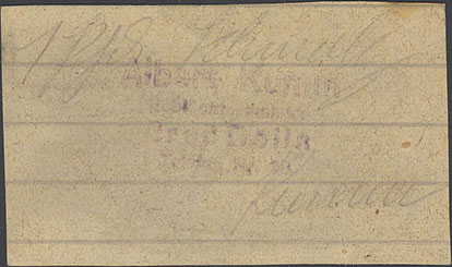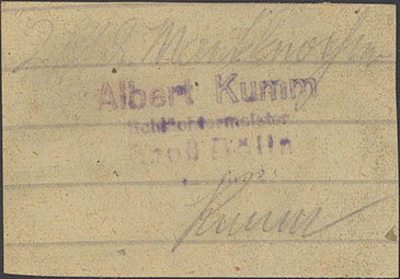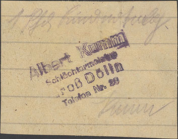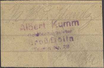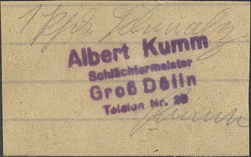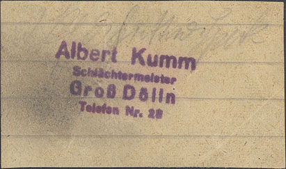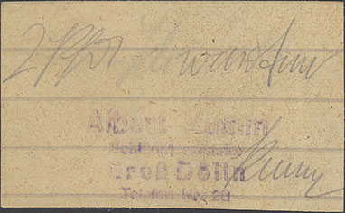 1 Pfund Schmalz ohne Datum; nicht katalogisiert; Vs.: Ware handschriftlich, Stempel violett; Rs.: leer; ohne Wz. |
