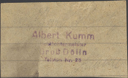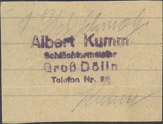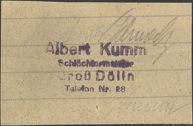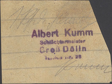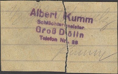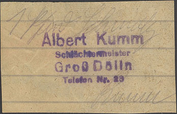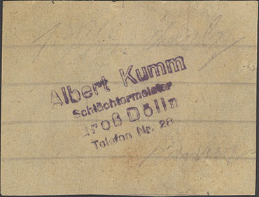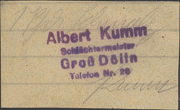 1 Pfund Rindertalg ohne Datum; nicht katalogisiert; Vs.: Ware handschriftlich, Stempel schwarz; Rs.: leer; ohne Wz. |