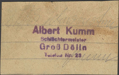 2 Stück Markknochen ohne Datum; nicht katalogisiert; Vs.: Ware handschriftlich, Stempel violett; Rs.: leer; ohne Wz. |