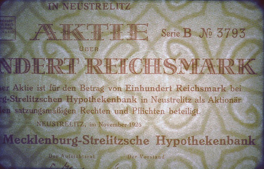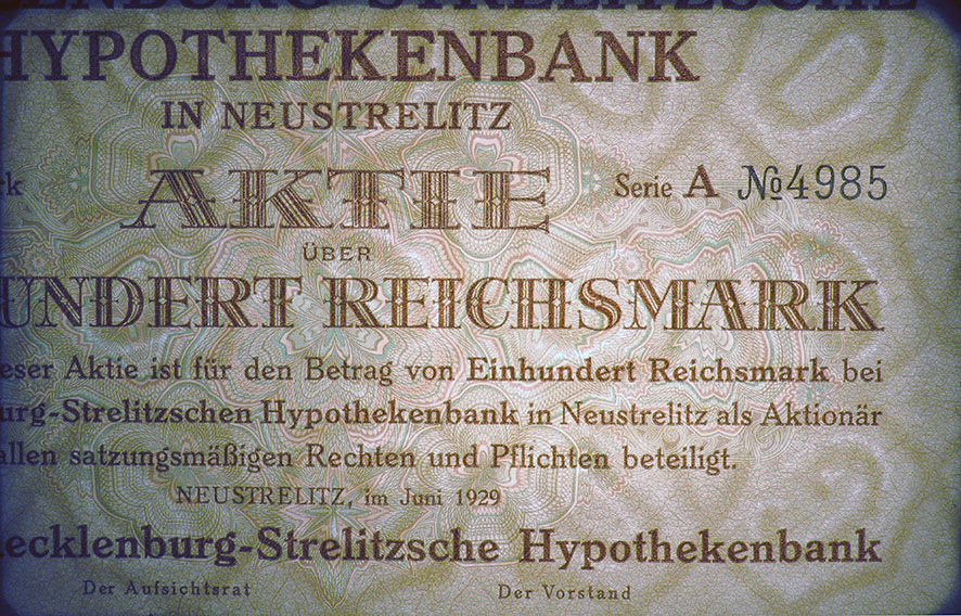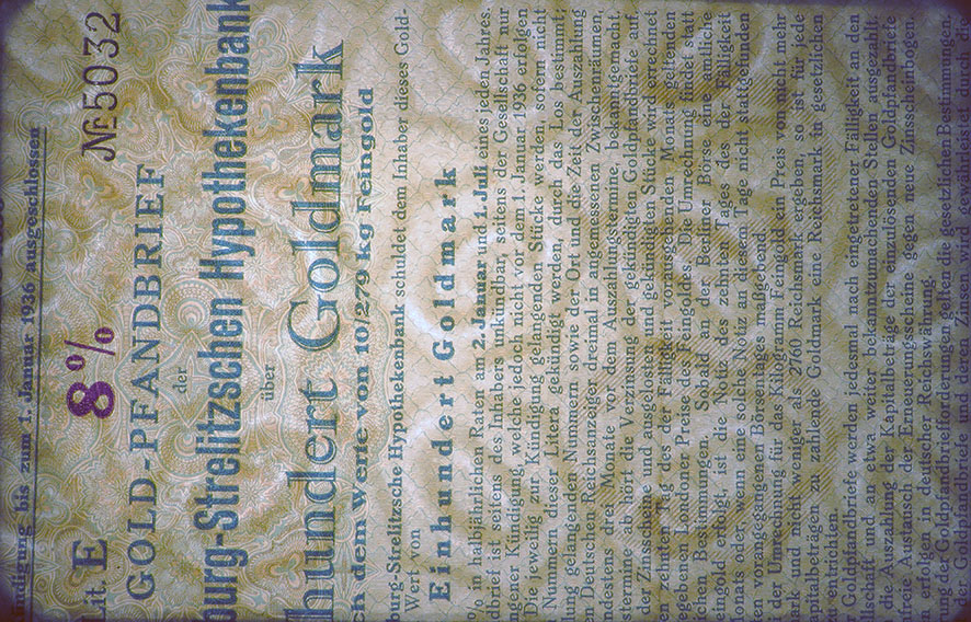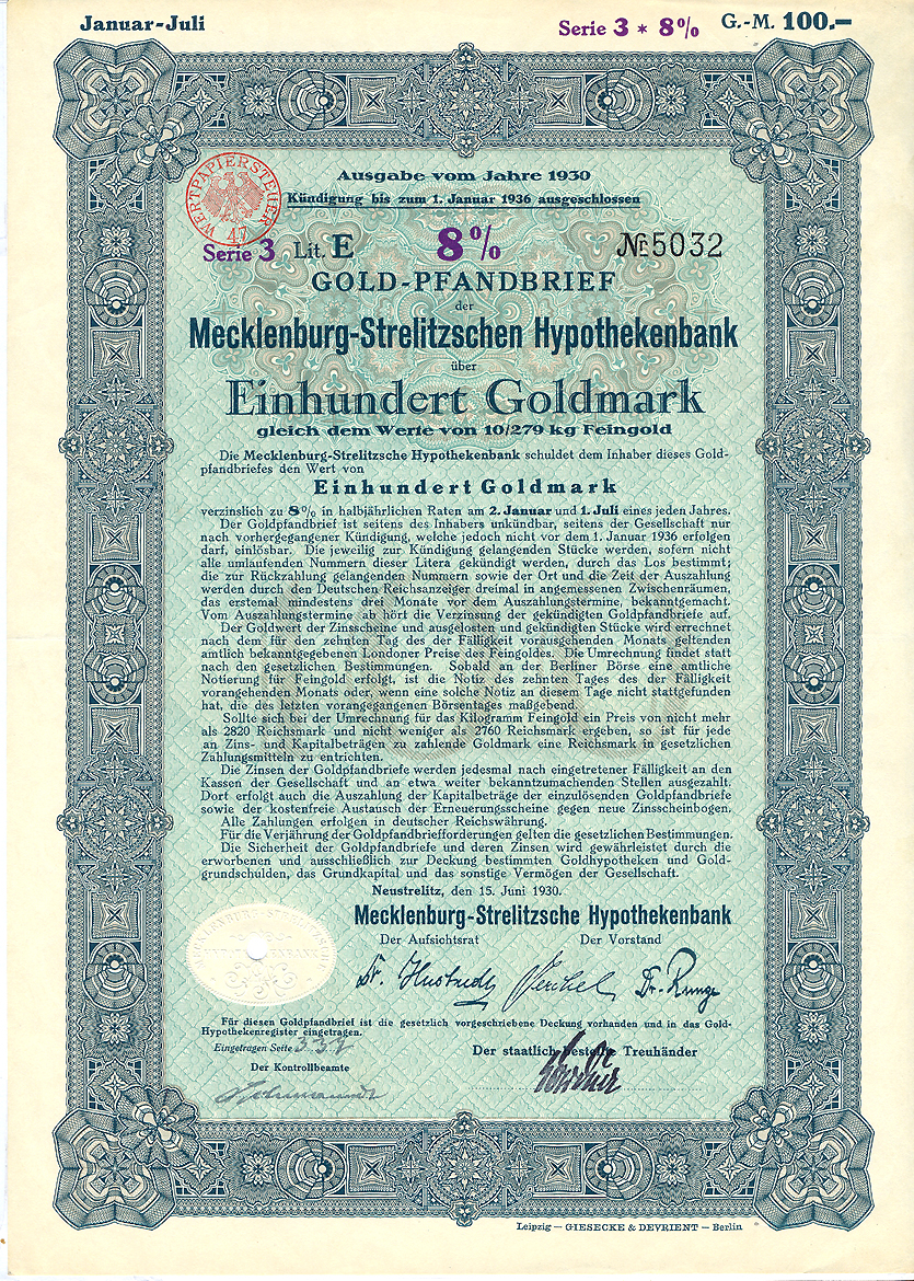 100 Goldmark; Gold-Pfandbrief, ausgegeben von 1930 bis 1937; Mecklenburg-Strelitzsche Hypothekenbank; ausgestellt in Neustrelitz, am 15 Juni 1930; nicht katalogisiert; Wz.: Giesecke Kreuzstern-Muster; Zum Inflationsschutz gab es die Golddeckung von 10/279 kg je 100 Goldmark; lochentwertet; Drfa.: Giesecke & Devrient, Leipzig |