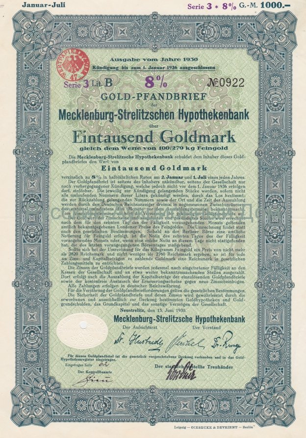 1.000 Goldmark; Gold-Pfandbrief, ausgegeben von 1930 bis 1937; Mecklenburg-Strelitzsche Hypothekenbank; ausgestellt in Neustrelitz, am 15 Juni 1930; nicht katalogisiert; Wz.: Giesecke Kreuzstern-Muster; Zum Inflationsschutz gab es die Golddeckung von 100/279 kg je 1.000 Goldmark; lochentwertet; Drfa.: Giesecke & Devrient, Leipzig |
