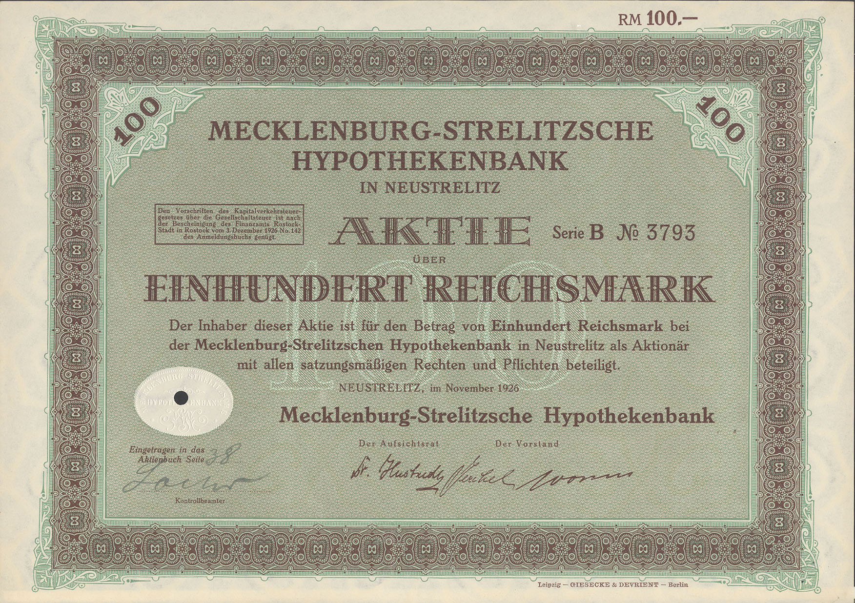 100 Reichsmark; Serie B; Mecklenburg-Strelitzsche Hypothekenbank; ausgestellt in Neustrelitz, im November 1926; nicht katalogisiert; Wz.: Giesecke Kreuzstern-Muster; Lochentwertet; Drfa.: Giesecke & Devrient, Leipzig |