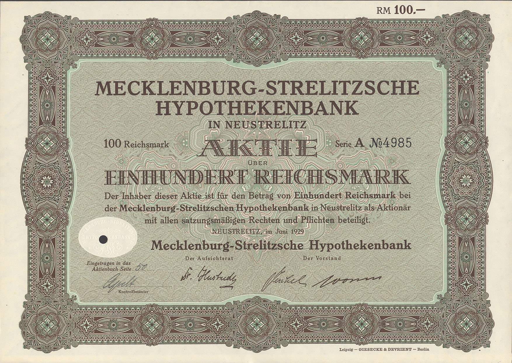 100 Reichsmark; Serie A; Mecklenburg-Strelitzsche Hypothekenbank; ausgestellt in Neustrelitz, im Juni 1929; SUPPES 2005/06-11918; Wz.: Giesecke Kreuzstern-Muster; Lochentwertet; Drfa.: Giesecke & Devrient, Leipzig |