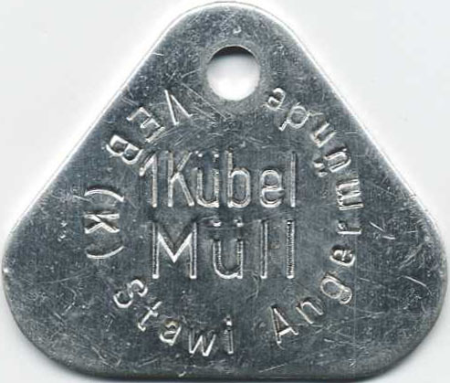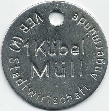 1 Kübel Müll o. J.; nicht katalogisiert; Vs. umlaufend: "VEB (K) Stadtwirtschaft Angermünde" mittig: "1 Kübel Müll"; Al; Dm=35,1mm; oben 5mm gelocht; Rs. leer |