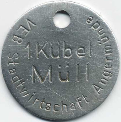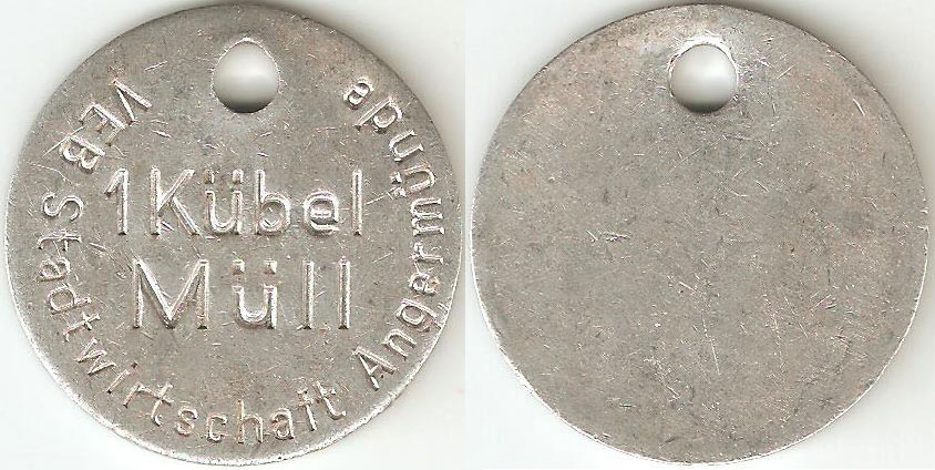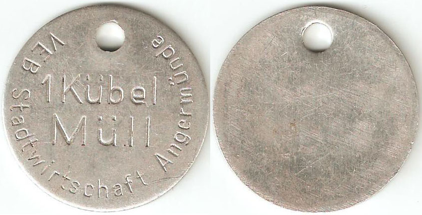1 Kübel Müll o. J.; Menzel 314.1; Vs. umlaufend: "VEB Stadtwirtschaft Angermünde" mittig: "1 Kübel Müll"; Al; Dm=35,1mm; oben 5mm gelocht; Rs. leer |
