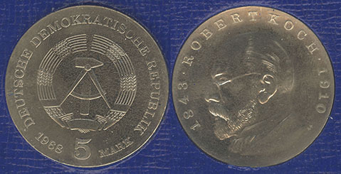 5 Mark; 16. Dezember 1968; Schön 21; 125. Geburtstag von Robert Koch; Vs.: Emplem der DDR und oben umlaufend: DEUTSCHE DEMOKRATISCHE REPUBLIK und unten umlaufend: 1968 5 MARK; Rs.: Kopf Koch nach links blickend und oben umlaufend: 1 8 4 3 • R O B E R T K O C H • 1 9 1 0; Glatter Rand mit: 5 MARK * 5 MARK * 5 MARK * 5 MARK *; Neusilber; Dm=29,0mm; Gewicht=12,2 g; Auflage: 100.226 Stück Gestaltung: Axel Bertram (Grafiker), Berlin Gerhard Rommel (Bildhauer), Berlin |