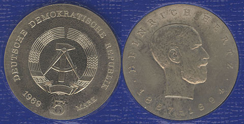5 Mark; 15. Dezember 1969; Schön 24; 75. Todestag von Heinrich Hertz; Vs.: Emplem der DDR und oben umlaufend: DEUTSCHE DEMOKRATISCHE REPUBLIK und unten umlaufend: 1969 5 MARK; Rs.: kopf Hertz nach rechts blickend und oben umlaufend: • H E I N R I C H H E R T Z • und unten umlaufend: 1 8 5 7 - 1 8 9 4; Glatter Rand mit: 5 MARK * 5 MARK * 5 MARK * 5 MARK *; Neusilber; Dm=29,0mm; Gewicht=12,2 g; Auflagenhöhe: 100.268 Stück; Gestaltung: Axel Bertram (Grafiker), Berlin Werner Rosenthal (Bildhauer), Berlin |