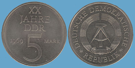 5 Mark; 25. September 1969; Schön 22.a; Vs.: XX / JAHRE / DDR / 5 und links 1969 und rechts: MARK; Rs.: Emplem der DDR und umlaufend: * DEUTSCHE DEMOKRATISCHE * und unten umlaufend: REPUBLIK; Glatter Rand mit: 5 MARK * 5 MARK * 5 MARK * 5 MARK *; Kupfernickel / Bronze; Dm=29,0mm; Gewicht=9,7g; Auflage: über 50 Millionen Stück; Gestaltung: Axel Bertram, Berlin |