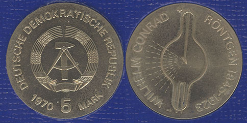 5 Mark; 10. Dezember 1970; Schön 26; 125. Geburtstag von Wilhelm Conrad Röntgen; Vs.: Emplem der DDR und oben umlaufend: DEUTSCHE DEMOKRATISCHE REPUBLIK und unten umlaufend: 1970 5 MARK; Rs.: Röntgengerät und oben umlaufend: WILHELM CONRAD RÖNTGEN 1845-1923; Glatter Rand mit: 5 MARK * 5 MARK * 5 MARK * 5 MARK *; Neusilber; Dm=29,0mm; Gewicht=12,2 g; Auflagenhöhe: 100.244 Stück; Gestaltung: Axel Bertram, Berlin |