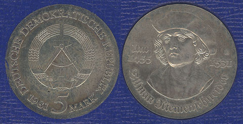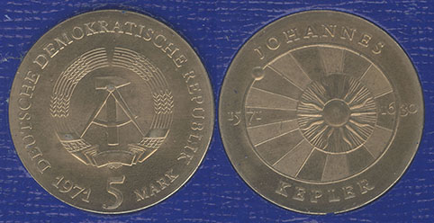 5 Mark; 15. Oktober 1971; Schön 30; 400. Geburtstag von Johannes Kepler; Vs.: Emplem der DDR und oben umlaufend: DEUTSCHE DEMOKRATISCHE REPUBLIK und unten umlaufend: 1971 5 MARK; Rs.: Sonnensystem und links: 1571 und rechts: 1630 und oben umlaufend: J O H A N N E S und unten umlaufend: K E P L E R; Glatter Rand mit: 5 MARK * 5 MARK * 5 MARK * 5 MARK *; Neusilber; Dm=29,0mm; Gewicht=12,2 g; Auflagenhöhe: 100.266 Stück; Gestaltung: Axel Bertram, Berlin |