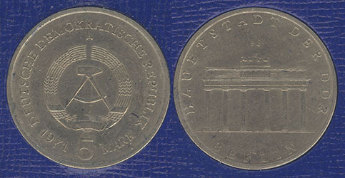 5 Mark; 8. Mai 1972; Schön 34a; Berlin, Hauptstadt der DDR (Brandenburger Tor) Vs.: A / Emplem der DDR und oben umlaufend: DEUTSCHE DEMOKRATISCHE REPUBLIK und unten umlaufend: 1971 5 MARK; Rs.: Brandenburger Tor und oben umlaufend: H A U P T S T A D T D E R D D R und unten umlaufend: B E R L I N; Glatter Rand mit: 5 MARK * 5 MARK * 5 MARK * 5 MARK *; Neusilber; Dm=29,0mm; Gewicht=9,6 g; Auflagenhöhe: 18.137.882 Stück; Gestaltung: Axel Bertram (Grafiker), Berlin Wilfried Fitzenreiter (Bildhauer), Berlin |