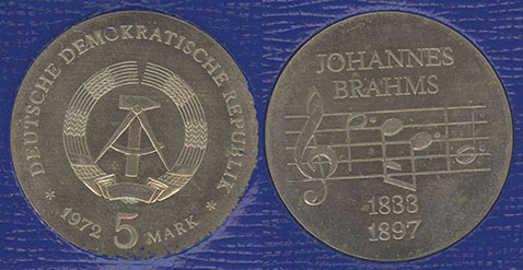 5 Mark; 25. August 1972; Schön 38; 75. Todestag von Johannes Brahms; Vs.: Emplem der DDR und oben umlaufend: * DEUTSCHE DEMOKRATISCHE REPUBLIK * und unten umlaufend: 1972 5 MARK; Rs.: JOHANNES / BRAHMS / Noten / 1833 / 1897; Glatter Rand mit: 5 MARK * 5 MARK * 5 MARK * 5 MARK *; Neusilber; Dm=29,0mm; Gewicht=12,2 g; Auflagenhöhe: 100.420 Stück; Gestaltung: Axel Bertram, Berlin |