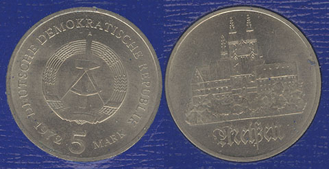 5 Mark; 20. November 1972; Schön 41; Vs.: A / Emplem der DDR und oben umlaufend: DEUTSCHE DEMOKRATISCHE REPUBLIK und unten umlaufend: 1972 5 MARK; Rs.: Burgberg mit Dom und Albrechtsburg / Meißen; Glatter Rand mit: 5 MARK * 5 MARK * 5 MARK * 5 MARK *; Neusilber; Dm=29,0mm; Gewicht=9,6 g; Auflagenhöhe: 10.199.353 Stück; Gestaltung: Axel Bertram, Berlin |