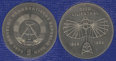 5 Mark; 10. Juli 1973; Schön 46; 125. Geburtstag von Otto Lilienthal; Vs.: Emplem der DDR und oben umlaufend: DEUTSCHE DEMOKRATISCHE REPUBLIK und unten umlaufend: 1972 5 MARK; Rs.: OTTO / LILIENTHAL Flugmodell / 1948 1896; Glatter Rand mit: 5 MARK * 5 MARK * 5 MARK * 5 MARK *; Neusilber; Dm=29,0mm; Gewicht=12,2 g; Auflagenhöhe: 100.300 Stück; Gestaltung: Axel Bertram, Berlin |