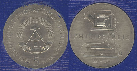 5 Mark; 17. Juni 1974; Schön 50; 100. Todestag von Philipp Reis; Vs.: Emplem der DDR und oben umlaufend: DEUTSCHE DEMOKRATISCHE REPUBLIK und unten umlaufend: 1974 5 MARK; Rs.: Morsestation / P H I L I P P R E I S / 1824-1874; Glatter Rand mit: 5 MARK * 5 MARK * 5 MARK * 5 MARK *; Neusilber; Dm=29,0mm; Gewicht=12,2 g; Auflagenhöhe: 100.200 Stück; Gestaltung: Axel Bertram, Berlin |