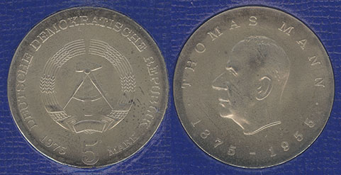 5 Mark; 9. Mai 1975; Schön 57; 100. Geburtstag von Thomas Mann; Vs.: Emplem der DDR und oben umlaufend: DEUTSCHE DEMOKRATISCHE REPUBLIK und unten umlaufend: 1975 5 MARK; Rs.: Kopf Mann nach links blickend und oben umlaufend: • T H O M A S M A N N • und unten umlaufend: 1 8 7 5 - 1 9 5 5; Glatter Rand mit: 5 MARK * 5 MARK * 5 MARK * 5 MARK *; Neusilber; Dm=29,0mm; Gewicht=12,2 g; Auflagenhöhe: 102.355 Stück; Gestaltung: Erika Schöneberg (Grafikerin), Berlin Rainer Radack (Bildhauer), Berlin |