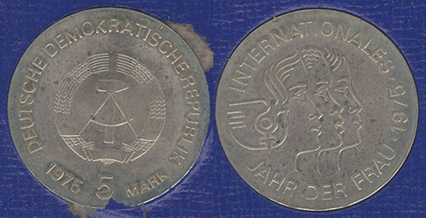 5 Mark; 16. Juni 1975; Schön 58; Internationales Jahr der Frau 1975; Vs.: Emplem der DDR und oben umlaufend: DEUTSCHE DEMOKRATISCHE REPUBLIK und unten umlaufend: 1975 5 MARK; Rs.: Drei Frauenköpfe nach rechts blickend und oben umlaufend: INTERNATIONALES und unten umlaufend: JAHR DER FRAU • 1975 •; Glatter Rand mit: 5 MARK * 5 MARK * 5 MARK * 5 MARK *; Neusilber; Dm=29,0mm; Gewicht=12,2 g; Auflagenhöhe: 161.047 Stück; Gestaltung: Klaus Hennig (Vorderseite), Berlin Axel Bertram (Rückseite), Berlin |