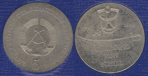 5 Mark; 6. Januar 1976; Schön 59; 200. Geburtstag von Ferdinand von Schill; Vs.: Emplem der DDR und oben umlaufend: * DEUTSCHE DEMOKRATISCHE REPUBLIK * und unten umlaufend: 1976 5 MARK; Rs.: 1776 Offiziershut 1809 / Säbel / FERDINAND / VON / SCHILL; Glatter Rand mit: 5 MARK * 5 MARK * 5 MARK * 5 MARK *; Neusilber; Dm=29,0mm; Gewicht=12,2 g; Auflagenhöhe: 100.216 Stück; Gestaltung: Axel Bertram (Grafiker), Berlin |
