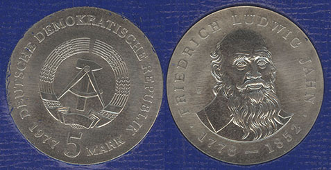 5 Mark; 15. Juni 1977; Schön 65; 125. Todestag von Friedrich Ludwig Jahn; Vs.: Emplem der DDR und oben umlaufend: DEUTSCHE DEMOKRATISCHE REPUBLIK und unten umlaufend: 1977 5 MARK; Rs.: Kopf Jahn und oben umlaufend: • FRIEDRICH LUDWIG JAHN • und unten umlaufend 1778 - 1852; Glatter Rand mit: 5 MARK * 5 MARK * 5 MARK * 5 MARK *; Neusilber; Dm=29,0mm; Gewicht=12,2 g; Auflagenhöhe: 90.675 Stück; Gestaltung: Heinz Rodewald (Grafiker), Berlin Wilfried Fitzenreiter (Bildhauer), Berlin |