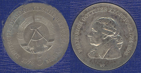 5 Mark; 28. Februar 1978; Schön 66; 175. Todestag von Friedrich Gottlieb Klopstock; Vs.: Emplem der DDR und oben umlaufend: DEUTSCHE DEMOKRATISCHE REPUBLIK und unten umlaufend: 1978 5 MARK; Rs.: Kopf Kloppstock nach links blickend und oben umlaufend: FRIEDRICH GOTTLIEB KLOPPSTOCK 1724-1803; Glatter Rand mit: 5 MARK * 5 MARK * 5 MARK * 5 MARK *; Neusilber; Dm=29,0mm; Gewicht=12,2 g; Auflagenhöhe: 75.500 Stück; Gestaltung: Karl Thewalt (Grafiker), Wittenberg Prof. Gerhard Lichtenfeld (Bildhauer), Halle (Saale) |