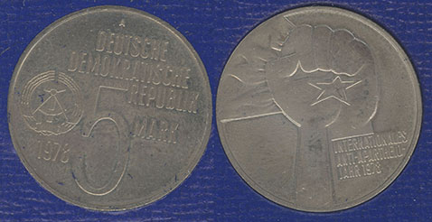5 Mark; 29. September 1978; Schön 70; Internationales Anti-Apartheid-Jahr 1978; Vs.: links: Emplem der DDR / 1978 und rechts: A / DEUTSCHE / DEMOKRATISCHE / REPUBLIK / 5 MARK; Rs.: Faust und unten rechts: INTERNATIONALES / ANTI-APARTHEID- / JAHR 1978; Glatter Rand mit: 5 MARK * 5 MARK * 5 MARK * 5 MARK *; Neusilber; Dm=29,0mm; Gewicht=9,6 g; Auflagenhöhe: 259.000 Stück; Gestaltung: Joachim Rieß (Grafiker), Chemnitz Volker Beier (Bildhauer), Chemnitz |