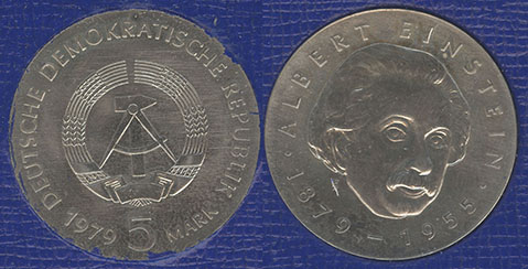 5 Mark; 26. Februar 1979; Schön 71; 100. Geburtstag von Albert Einstein; Vs.: Emplem der DDR und oben umlaufend: DEUTSCHE DEMOKRATISCHE REPUBLIK und unten umlaufend: 1979 5 MARK; Rs.: Kopf Einstein und oben umlaufend: • A L B E R T E I N S T E I N • und unten umlaufend: 1 8 7 9 - 1 9 5 5; Glatter Rand mit: 5 MARK * 5 MARK * 5 MARK * 5 MARK *; Neusilber; Dm=29,0mm; Gewicht=12,2 g; Auflagenhöhe: 55.500 Stück; Gestaltung: Heinz Rodewald (Grafiker), Berlin Wilfried Fitzenreiter (Bildhauer), Berlin |