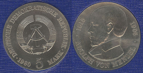 5 Mark; 20. Juni 1980; Schön 76; 75. Todestag von Adolph von Menzel; Vs.: Emplem der DDR und oben umlaufend: * DEUTSCHE DEMOKRATISCHE REPUBLIK * und unten umlaufend: 1980 5 MARK; Rs.: Kopf Menzel und oben umlaufend: • 1815 1905 • und unten umlaufend: ADOLPH VON MENZEL; Glatter Rand mit: 5 MARK * 5 MARK * 5 MARK * 5 MARK *; Neusilber; Dm=29,0mm; Gewicht=12,2 g; Auflagenhöhe: 54.750 Stück; Gestaltung: Dietrich Dorfstecher (Grafiker), Berlin Gerhard Rommel (Bildhauer), Berlin |