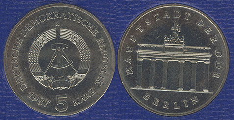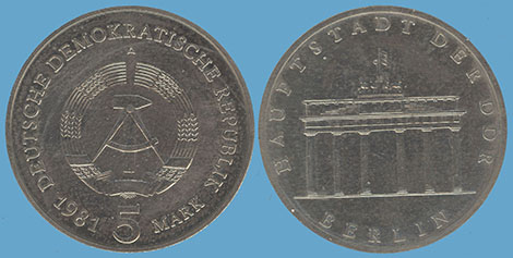5 Mark; 1987; Schön 34.j; Berlin, Hauptstadt der DDR (Brandenburger Tor); Vs.: A / Emplem der DDR und oben umlaufend: DEUTSCHE DEMOKRATISCHE REPUBLIK und unten umlaufend: 1981 5 MARK; Rs.: Brandenburger Tor und oben umlaufend: H A U P T S T A D T D E R D D R und unten umlaufend: B E R L I N; Glatter Rand mit: 5 MARK * 5 MARK * 5 MARK * 5 MARK *; Neusilber; Dm=29,0mm; Gewicht=9,6 g; Auflagenhöhe: 347.310 Stück; Gestaltung: Axel Bertram (Grafiker), Berlin Wilfried Fitzenreiter (Bildhauer), Berlin |