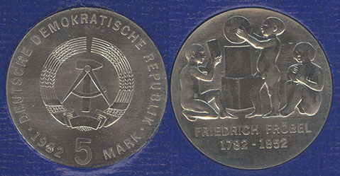 5 Mark; 5. April 1982; Schön 84; 200. Geburtstag von Friedrich Fröbel; Vs.: Emplem der DDR und oben umlaufend: * DEUTSCHE DEMOKRATISCHE REPUBLIK * und unten umlaufend: 1982 5 MARK; Rs.: Spielende Kinder / FRIEDRICH FRÖBEL / 1782 - 1852; Glatter Rand mit: 5 MARK * 5 MARK * 5 MARK * 5 MARK *; Neusilber; Dm=29,0mm; Gewicht=12,2 g; Auflagenhöhe: 54.500 Stück; Gestaltung: Dietrich Dorfstecher (Grafiker), Berlin Gerhard Rommel (Bildhauer), Berlin |