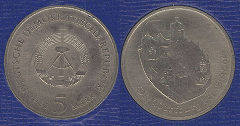 5 Mark; 28. Juli 1982; Schön 86; Eisenach, Wartburg bei Eisenach; Vs.: A / Emplem der DDR und oben umlaufend: DEUTSCHE DEMOKRATISCHE REPUBLIK und unten umlaufend: 1982 5 MARK; Rs.: Wartburg und unten umlaufend: Die Wartburg bei Eisenach; Glatter Rand mit: 5 MARK * 5 MARK * 5 MARK * 5 MARK *; Neusilber; Dm=29,0mm; Gewicht=9,6 g; Auflagenhöhe: 205.000 Stück; Gestaltung: Heinz Rodewald, Berlin |