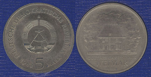 5 Mark; 22. Juni 1982; Schön 87; Vs.: A / Emplem der DDR und oben umlaufend: DEUTSCHE DEMOKRATISCHE REPUBLIK und unten umlaufend: 1982 5 MARK; Rs.: Weimar, Göthes Gartenhaus / GOETHES GARTENHAUS / WEIMAR; Glatter Rand mit: 5 MARK * 5 MARK * 5 MARK * 5 MARK *; Neusilber; Dm=29,0mm; Gewicht=9,6 g; Auflagenhöhe: 205.500 Stück; Gestaltung: Heinz Rodewald, Berlin |