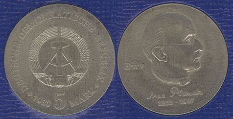 5 Mark; 20. Oktober 1983; Schön 93; 125. Geburtstag von Max Planck; Vs.: Emplem der DDR und oben umlaufend: * DEUTSCHE DEMOKRATISCHE REPUBLIK * und unten umlaufend: 1983 5 MARK; Rs.: Kopf Planck nach rechts blickend und links: E=h*v und unten Max Planck / 1858 - 1947; Glatter Rand mit: 5 MARK * 5 MARK * 5 MARK * 5 MARK *; Neusilber; Dm=29,0mm; Gewicht=12,2 g; Auflagenhöhe: 55.800 Stück; Gestaltung: Dietrich Dorfstecher (Grafiker), Berlin Evelyn Nitzsche-Hartnick (Bildhauerin), Berlin |