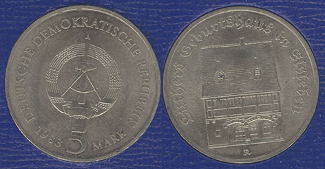 5 Mark; 10. März 1983; Schön 89; 500. Geburtstag von Martin Luther – Geburtshaus in Eisleben; Vs.: A / Emplem der DDR und oben umlaufend: DEUTSCHE DEMOKRATISCHE REPUBLIK und unten umlaufend: 1983 5 MARK; Rs.: Luthers Geburtshaus / R und oben umlaufend: Luthers Geburtshaus in Eisleben; Glatter Rand mit: 5 MARK * 5 MARK * 5 MARK * 5 MARK *; Neusilber; Dm=29,0mm; Gewicht=9,6 g; Auflagenhöhe: 197.680 Stück; Gestaltung: Heinz Rodewald, Berlin |