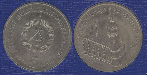 5 Mark; 17. Januar 1983; Schön 90; 500. Geburtstag von Martin Luther – Schlosskirche (Wittenberg); Vs.: A / Emplem der DDR und oben umlaufend: DEUTSCHE DEMOKRATISCHE REPUBLIK und unten umlaufend: 1983 5 MARK; Rs.: Schloßkirche und oben umlaufend: Schloßkirche zu Wittenberg; Glatter Rand mit: 5 MARK * 5 MARK * 5 MARK * 5 MARK *; Neusilber; Dm=29,0mm; Gewicht=9,6 g; Auflagenhöhe: 196.500 Stück; Gestaltung: Heinz Rodewald, Berlin |