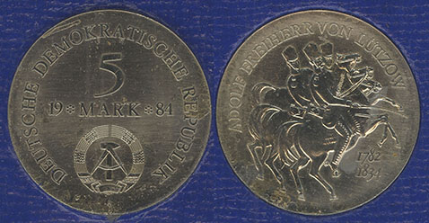 5 Mark; 10. Oktober 1984; Schön 97; 150. Todestag von Adolf Freiherr von Lützow; Vs.: oben umlaufend: DEUTSCHE DEMOKRATISCHE REPUBLIK und mittig: 5 / 19 * MARK * 84 / Emblem der DDR / A; Rs.: Drei Husaren und unten rechts: 1782 / 1834 und oben umlaufend: ADOLF FREIHERR VON LÜTZOW; Glatter Rand mit: 5 MARK * 5 MARK * 5 MARK * 5 MARK *; Neusilber; Dm=29,0mm; Gewicht=12,2 g; Auflagenhöhe: 45.000 Stück; Gestaltung: Dietrich Dorfstecher (Grafiker), Berlin Gerhard Rommel (Bildhauer), Berlin |