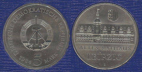 5 Mark; 9. März 1984; Schön 98; Leipzig, Altes Rathaus; Vs.: A / Emplem der DDR und oben umlaufend: DEUTSCHE DEMOKRATISCHE REPUBLIK und unten umlaufend: 1984 5 MARK; Rs.: Leioziger Rathaus / ALTES RATHAUS / LEIPZIG / R; Glatter Rand mit: 5 MARK * 5 MARK * 5 MARK * 5 MARK *; Neusilber; Dm=29,0mm; Gewicht=9,6 g; Auflagenhöhe: 204.500 Stück; Gestaltung: Heinz Rodewald, Berlin |